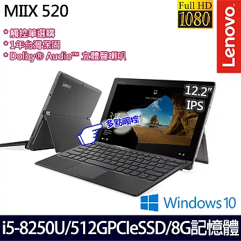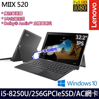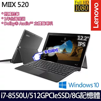 產品說明⊕商品簡介⊕商品規格●型號:LENOVO MIIX 520-12IKB 81CG01JQTW ●尺寸:12.2吋 FHD IPS(1920X1200) 鏡面, 10點觸控●處理器:INTEL CORE I7-8550U 四核 1.8GHZ (8M CACHE, UP TO 4.0 GHZ)●記憶體:8GB DDR4-2133MHZ (ON BOARD)●硬碟:512GB PCIE SSD●顯示介面:INTEL UHD GRAPHICS 620●作業系統:WINDOWS 10 HOME (64BIT)●無線網路:802.11 AC●攝影機/網路攝影機:-5M 正面定焦-8M 自動對焦 WORLDVIEW 攝影機●連接埠:1 X USB3.0 TYPE C,1 X USB3.0,HDMI,複合式音訊插孔●音效:DOLBY AUDIO 立體聲喇叭●電池:2 CELL / 39WH / UP TO 7.5HR●藍芽:支援 BT4.1●尺寸:約 300 X 205 X 9.9 MM (平板模式) / 300 X 205 X 15.9 MM (含鍵盤)●重量:約 880G (平板) / 1.25KG (含鍵盤)* 附磁吸式鍵盤、觸控筆●保固:原廠一年台灣保固/保固期間內提供免費電話技術支援 (0800-000-702)●LENOVO服務