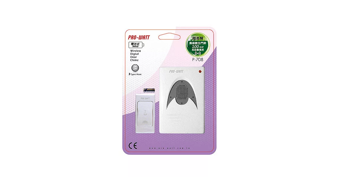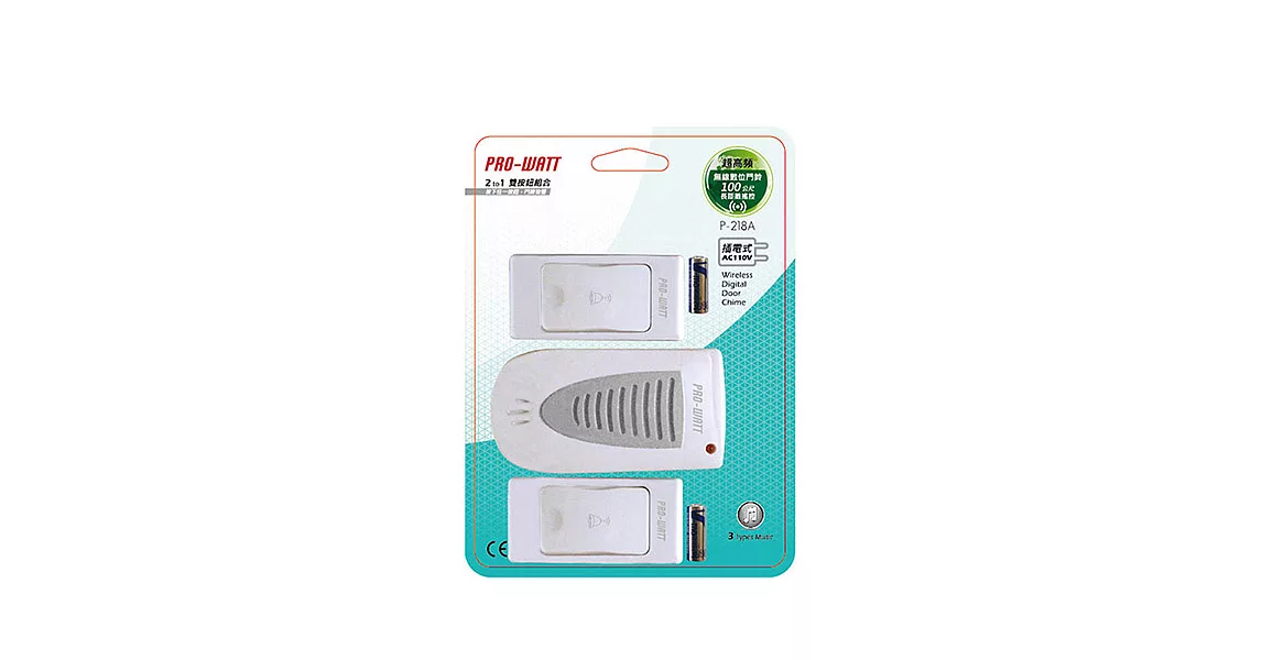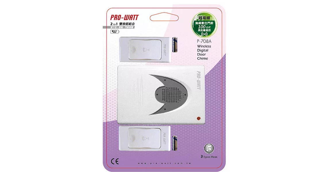 以往舊有門鈴線路均埋在牆壁裡,不易更換,現在介紹您一款不影響美觀的無線數位門鈴!PRO-WATT 無線數位雙門鈴( P-708DC )採用專業超高頻的設計,內置超強數位抗干擾系統,不但可避免用戶之間及外界信號干擾,而且採用最簡易的無線門鈴安裝,完全不會有線路的問題。還有貼心超遠遙控距離長達120公尺,絕對可滿足各式住宅及高樓之需求。無論是居家、辦公室、工廠、旅館皆適用哦!