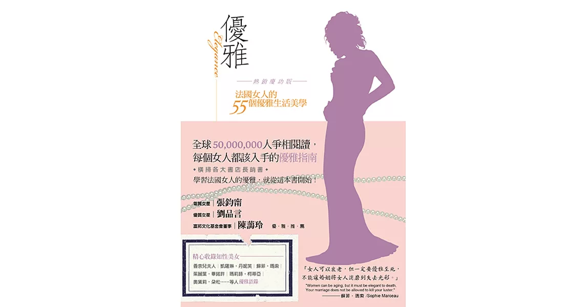 內容簡介 ★氣質女星|張鈞甯 ★優質女星|劉品言 ★富邦文化基金會董事|陳藹玲 ───優雅推薦! 法國女人的優雅是由內而外的散發,如何增加魅力,增添優雅知性氣質,原來法國女人是有些秘訣的…… ★法國女人的穿衣秘訣: 1 穿衣鏡:法國女人常說:「穿衣鏡是女人的半身。」 2 衣櫃必備品:絲巾、黑色小洋裝、長筒靴、手提包、復古太陽眼鏡。 3 身上不要超過三種色系。 4香水,法國人曾說:「一個沒有香水的世界,就是一個沒有生命的世界。」 ★法國女人的吃不胖秘訣: 1 不節食。法國女人從不挨餓,從不用零食和水果代替主餐,但也從不把肚子塞得鼓鼓脹脹。 2 少而精。寧願吃一塊上好的黑巧克力,也不要吃一打廉價餅乾。 3 原汁原味。儘量吃原汁原味的東西,不要吃經過太多加工、富含化學物質的食品。如果妳吃進垃圾,那妳也會變成垃圾。 4 細嚼慢嚥。吃一頓飯至少要花二十分鐘,要坐下來,慢慢享受進食的樂趣,而不要在走路、看電視、看書的時候,倉促吃東西。 5 多喝水,多走路。多喝純淨的水,而不是化學飲料。去哪兒都用走的,盡可能爬樓梯。 ★法國女人的獨特肢體語言: 1 一個或多個手指在太陽穴周圍畫圈,表示「那傢伙腦子有問題」。 2 用拳頭頂住鼻子並作出旋轉的動作,表示「那傢伙喝醉了」。 3 舔手指表示「美味」,可以指食物,也可以指街上的美女。 4 用右手將右眼的下眼瞼往下拉,表示「我不相信」。 5 伸出下嘴唇,同時抬高眉毛和肩部,表示「不知道、不同意或不負責任」。 6 用手掠過前額,表示「我已經受夠了」。 7 用手指背面敲打右側臉頰,像觸摸鬍鬚一樣,表示「真無聊」。 橫掃各大書店長銷書! 學習法國女人的優雅,就從這本書開始! 每個女人都該入手的優雅指南! ★學會法式優雅的第一本入門書! ★一個深諳法式優雅之道的東方女人,帶領妳向巴黎女人學優雅。 ★優雅是一種生活態度,每個女人都有過優雅生活的能力! 本書特別精心收錄世界知名女性的優雅語錄! 容貌是天生的,但氣質可以培養,優雅是一種生活態度! 妳可以不美麗,但不能不優雅! ★學會法式優雅的第一本入門書! ★一個深諳法式優雅之道的東方女人,帶領妳向巴黎女人學優雅。 ★優雅是一種生活態度,每個女人都有過優雅生活的能力! 香奈兒、凱薩琳丹妮芙、蘇菲瑪索、茱麗葉畢諾許、艾曼紐琵雅……全世界的女人都羨慕巴黎女人!為什麼她們的裝扮就是如此優雅?為什麼她們一舉一動都那麼時尚、迷人又知性?為什麼她們坐擁美食還能享受苗條的身材?為什麼她們永遠不會老?!本書將為你揭開巴黎女人的性感秘密! 提到優雅,再沒有比法國女人,尤其是巴黎女人更有資格詮釋的了!只有深諳法式優雅之道的東方女人,更懂東方女人的內心需求。本書作者歐石楠長居巴黎約8年多的時間,對法國女人的時尚裝扮以及為人處世之道了解得甚為透徹。她將這些心得體會都寫了下來,希望藉由書裡的55個優雅法則,讓每一個看到這本書的女人都能透過這本小書,都能認識自己、接受自己、愛上自己,一步一步、從內到外走向優雅,從此改變自己枯燥乏味、一成不變的生活,擁抱完美幸福的人生! |